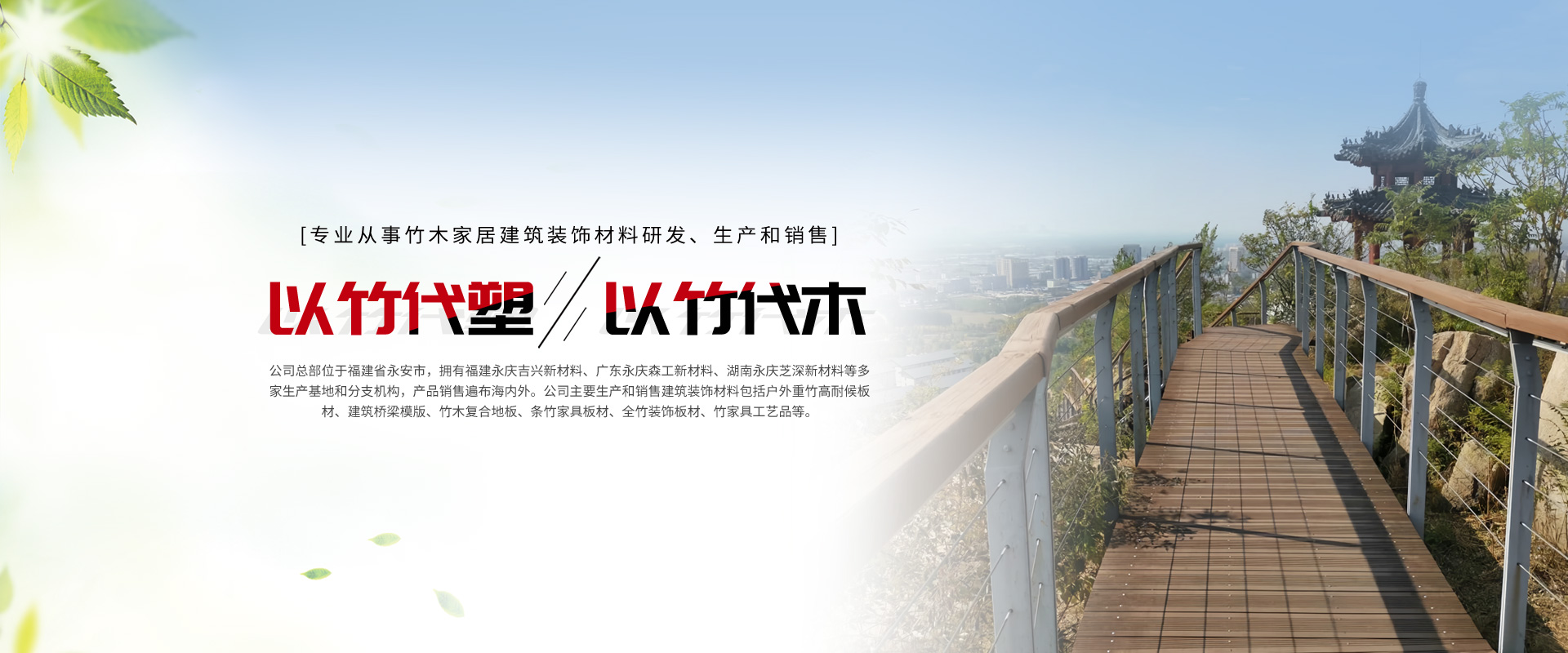 廈門永慶家居建材有限公司是福建永慶新材科技集團公司旗下一家專業(yè)從事竹木家居建筑裝飾材料研發(fā)、生產(chǎn)和銷售的企業(yè)。公司總部位于福建省永安市,擁有福建永慶吉興新材料、廣東永慶森工新材料、湖南永慶芝深新材料等多家生產(chǎn)基地和分支機構(gòu),產(chǎn)品銷售遍布海內(nèi)外。公司主要生產(chǎn)和銷售建筑裝飾材料包括戶外重竹高耐候板材、建筑橋梁模版、竹木復(fù)合地板、條竹家具板材、全竹裝飾板材、竹家具工藝品等。公司注重產(chǎn)品品質(zhì)和創(chuàng)新,引進世界先進的生產(chǎn)設(shè)備和技術(shù),不斷推出高品質(zhì)、高性能、環(huán)保、節(jié)能的新型竹木建筑裝飾材料,獲得了廣泛的市場認可和用戶信賴。